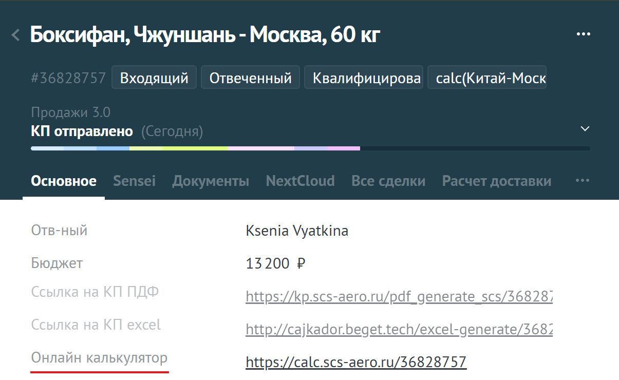 1. Перейдите по ссылке в поле «Онлайн калькулятор» в карточке сделки